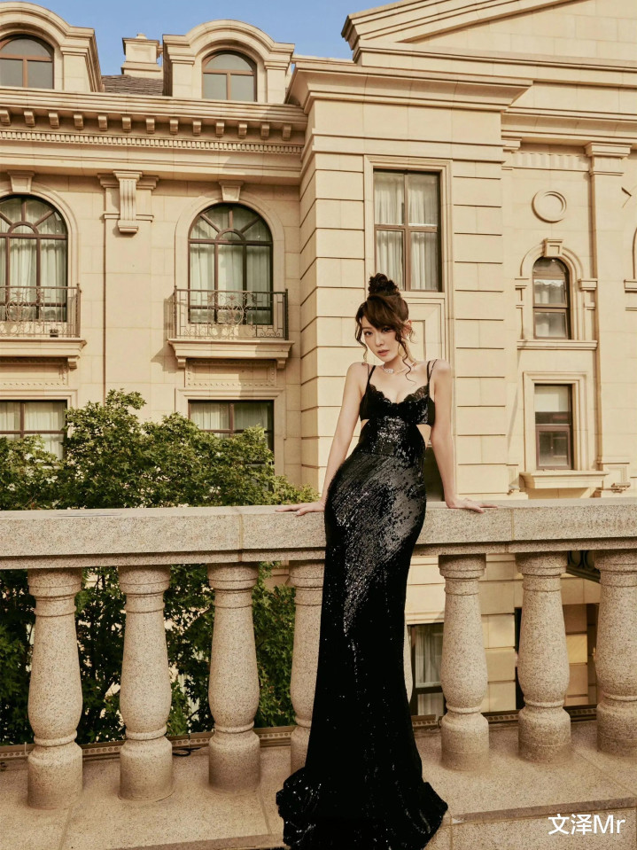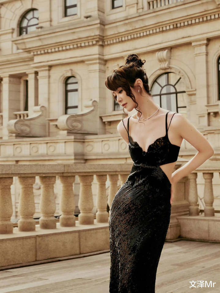 坐姿优雅到不行,黑色亮片礼服闪烁,手轻轻放在腿上,眼神温柔又宁静,既有时尚的华丽,又有温柔的气质,这是什么神仙融合啊